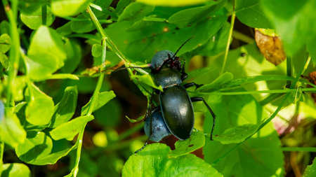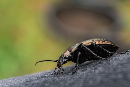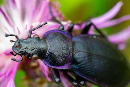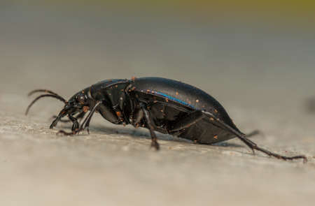 Macro shot of the Bronze ground beetle or bronze carabid (Carabus nemoralis) - a large, black ground beetle with coppery sheen and the edges of its elytra iridescent purple