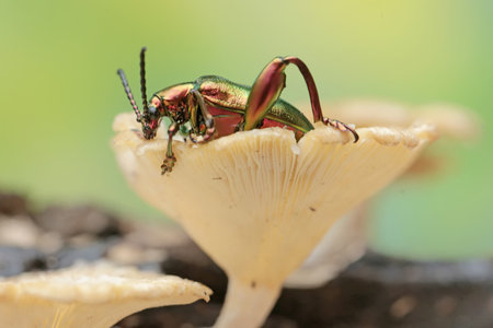 Close up of a beetle on a mushroom in the rainforest.