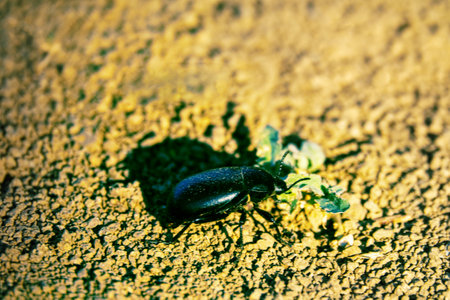 Close up of a beetle on the forest floor. Macro photography.