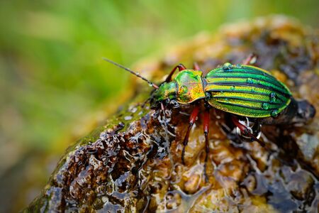 Golden ground beetle, Carabus auronitens, beautiful glossy insect on the wet stone. Water scene with shiny Golden ground beetle. Bright green insect in the nature habitat, Krkonose, Czech republic.