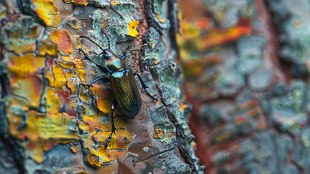 A beetle crawling on a textured tree bark, showcasing its intricate patterns