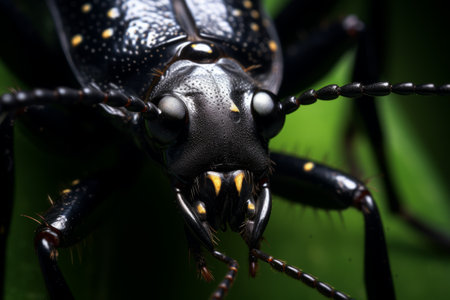 Black beetle perched on vibrant leaves, showcasing intricate details and textures. Nature and entomology concept with green background.