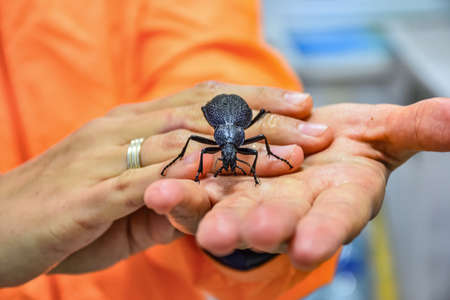 Big black beetle in human hands