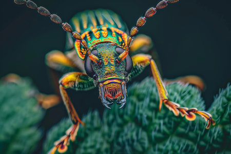 Captivating close-up of a colorful beetle displaying iridescent wings perched on vibrant green leaves, showcasing the beauty of nature's diversity and intricate details.