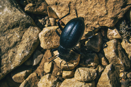 a black beetle on the ground of a field full of stones