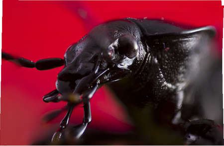 Macro of longhorn beetle, Prionus coriarius on violet blossom flower