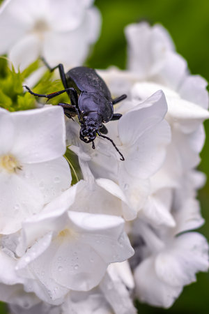 Black beetle on white flowers with subtle raindrops on petals. Contrasts.