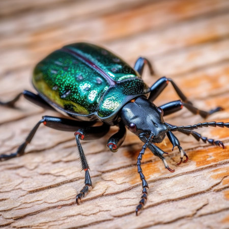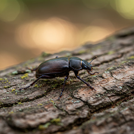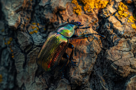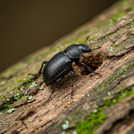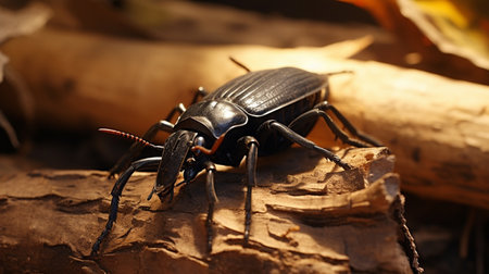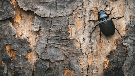 A stunning macro shot of a black beetle on the textured bark, capturing the intricate details of both the insect and its natural wooden environment. Perfect for nature photography.