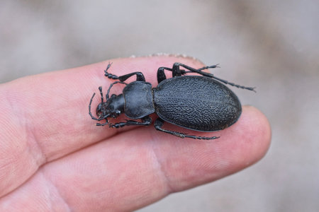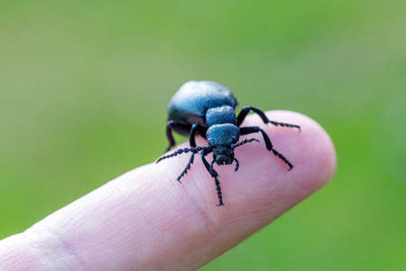 big poisonous Violet oil beetle, Meloe violaceus on human finger. Spring time. Europe Czech Republic wildlife