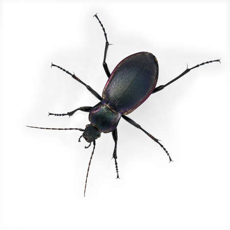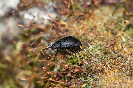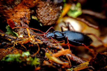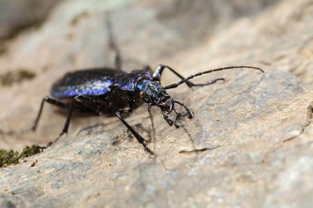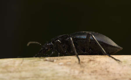 Macro shot of the Bronze ground beetle or bronze carabid (Carabus nemoralis) - a large, black ground beetle with coppery sheen and the edges of its elytra iridescent purple