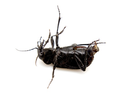 Close-up of dead black beetle (Capnodis tenebrionis) on flooring in house. Pest control concept. Extermination.