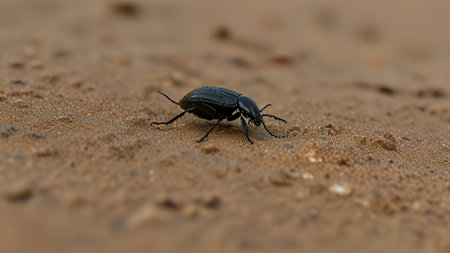 Close up of a Shiny Black Beetle Crawling on Moist Soil with Vibrant Detail and Textures AI Generative