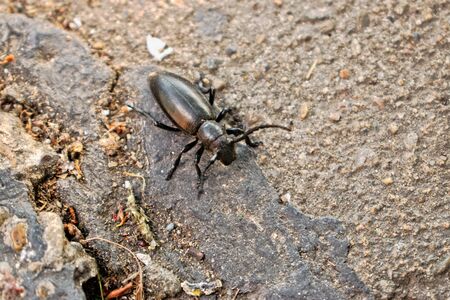 The longhorn black beetle (Cerambycidae; also known as long-horned or longicorns) crawls along the road. Close-up photo