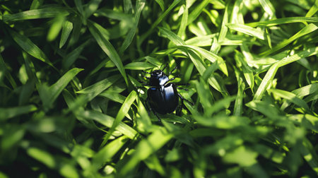 A striking close-up of a shiny beetle nestled in vibrant green grass, showcasing the intricate details of nature. Perfect for nature enthusiasts.
