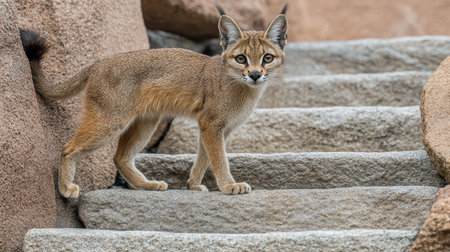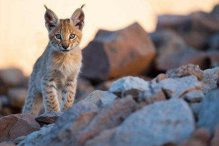 a lynx looking out from desert rocks during dusk, created with generative ai