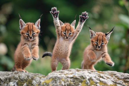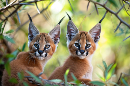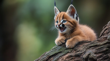 A playful caracal kitten perched on a tree branch, showcasing its adorable features in a lush natural habitat