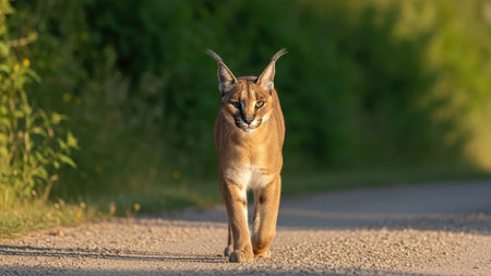 Caracal, African lynx, on the tree vegetation. Beautiful wild cat in nature habitat, Botswana, South Africa.Wildlife scene from nature. Animal face to face walking on gravel road, Felis caracal.