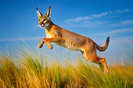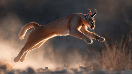 A caracal displays remarkable agility as it jumps over dusty plains, captured in motion with a blurred background emphasizing its speed and form.
