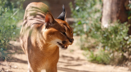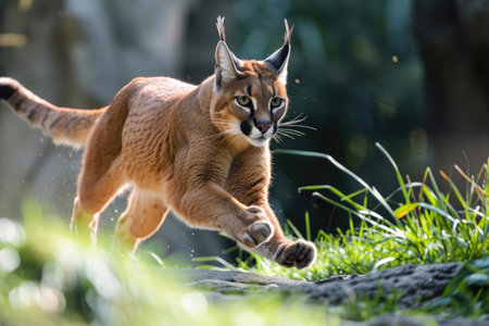 Closeup of Caracal, African lynx. Desert cat walking in green grass vegetation. Wild cat in nature, South Africa. Adult Caracal Caracal outdoor. Felis caracal in blurred background.