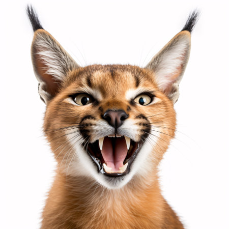 majestic caracal sits poised, its tufted ears attentively pointed forward. The feline’s striking blend of colors stands out vividly against the white backdrop.