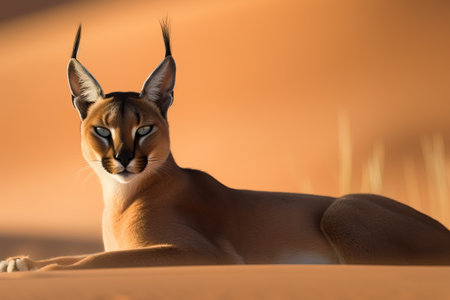 Beautiful portrait of Caracal, Desert Lynx lying between dunes. Amazing African Wildlife. Generative Ai