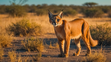 The Caracal is captured mid-prowl, showcasing its powerful muscles and lithe movements