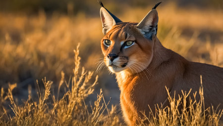 A close-up shot showcases a caracal cat, distinguished by its prominent ears. The animal's fur displays shades of brown and tan, while the background reveals a sunset's warm hues of orange and purple. This image, with its soft lighting and composition, might be suitable for various commercial or editorial applications.