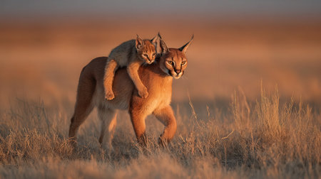 Male caracal with caracal kitten, text space on left, object on right for balanced composition