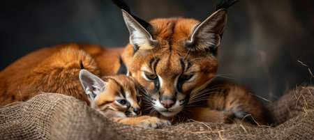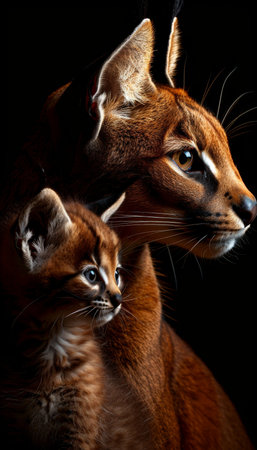 Male caracal and caracal kitten portrait with empty space on left for text placement