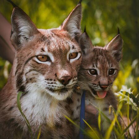 Adorable Eurasian Lynx with cub, portrait at summer field