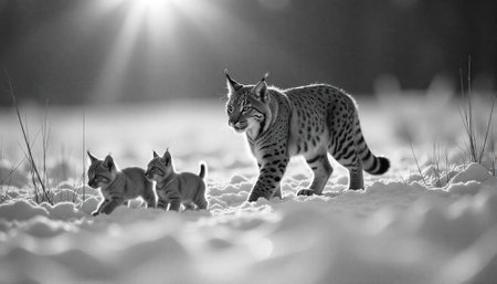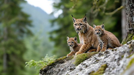 A calm lynx with elegant fur rests on a mossy rock in a tranquil forest, showcasing natures beauty