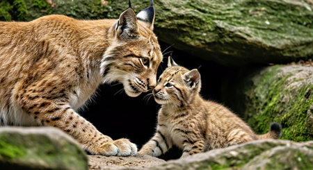 A pair of lynxes sit nearby and caress (lick) each other, a symbol of the family. Beautiful big wild cat lynx.