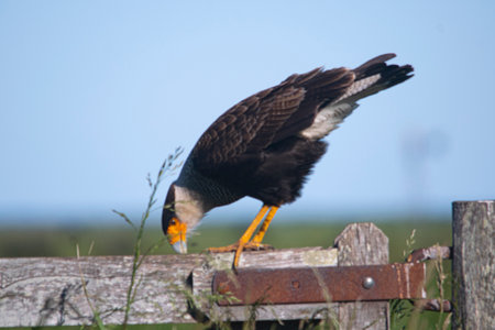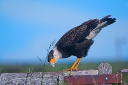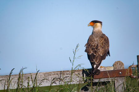 Crested caracara on a gate, in the country, in Argentina