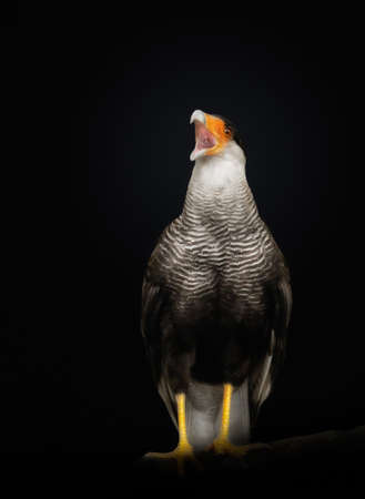 Close up of a Southern crested caracara calling against black background, Pantanal, Brazil.