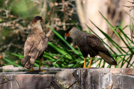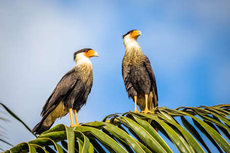 Couple of beautiful crested caracara birds together on palm tree outdoors
