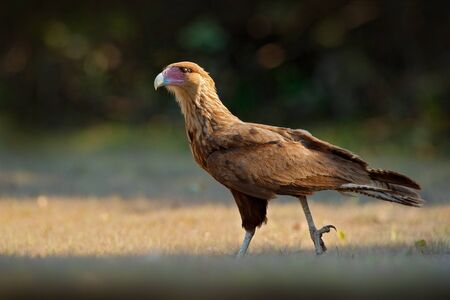 Southern Caracara, walking in the grass, Pantanal, Brazil. Portrait of birds of prey Caracara plancus. Caracara in green grass vegetation. Wildlife scene from Brazil. Bird from tropic forest.