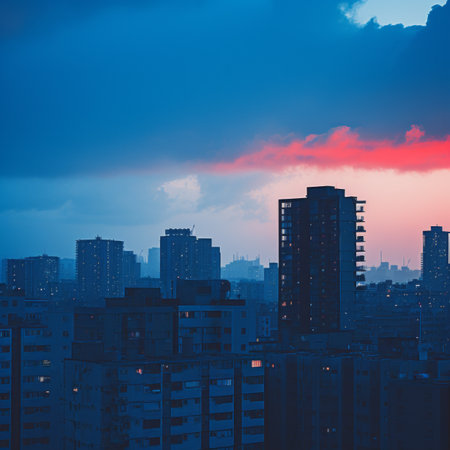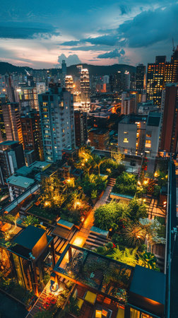 As twilight sets, the vibrant lights of the city contrast with the serene greenery of an eco-conscious rooftop garden space