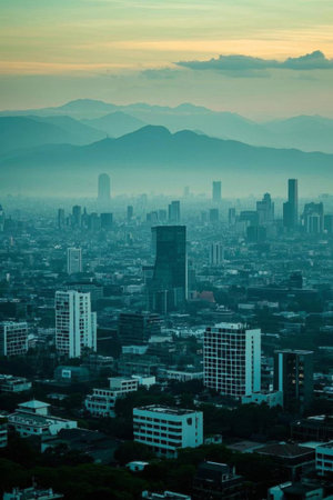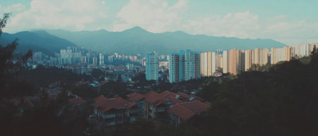 Cinematic panoramic view of a vibrant cityscape against a mountainous backdrop