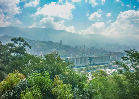 Aerial view of buildings and mountains from Nutibara hill in Medellin, one of the most important cities of Colombia, in South America
