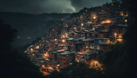 Dark mountain landscape, cityscape illuminated by poverty, rural hut crowded generated by artificial intelligence