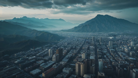 Breathtaking aerial view of a sprawling city nestled amidst majestic mountains, under a dramatic, cloud filled sky. Ai generated image