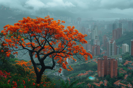 Flamboyant tree in the fog, Shenzhen, China