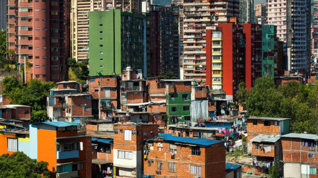 A vibrant urban scene depicting the contrast between colorful high-rise buildings and informal settlements in Venezuela, highlighting diverse living conditions and community life.