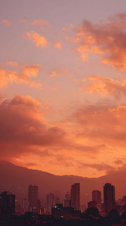 A sunset rooftop sky warm gradient orange clouds city skyline silhouette mountains