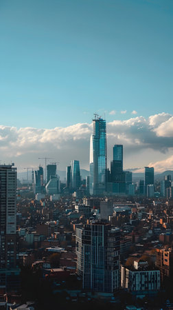 This stunning aerial view showcases the impressive skyline of a thriving,technologically-advanced urban center The towering skyscrapers and interconnected buildings suggest a city that has seamlessly