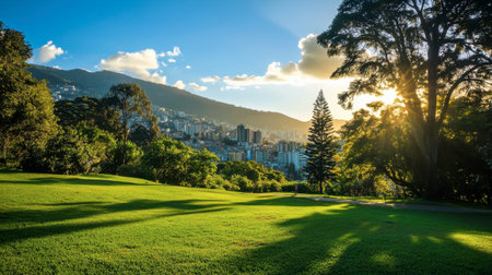 A picturesque park scene showcasing lush green grass, vibrant trees, and a stunning city skyline at sunset, reflecting a harmonious blend of nature and urban life.