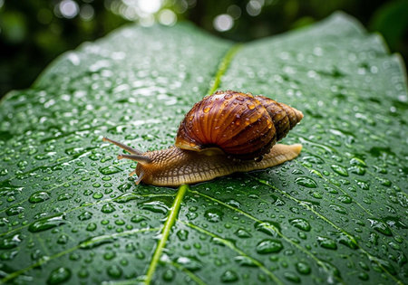 Close-up of snail on wet fern leaf in forest outdoors. Selective focus on mollusc. Macro photo.