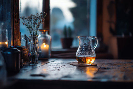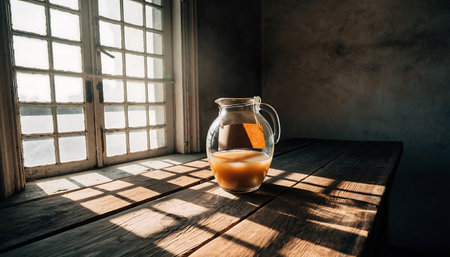 a pitcher of water sits on a table in front of a window, showcasing the interplay of light and shadow. this high-quality, uhd image captures the essence of japanese photography with its light orange and light brown tones. the romanticized country life is beautifully depicted, making it a perfect addition to the cabincore aesthetic. ai generated