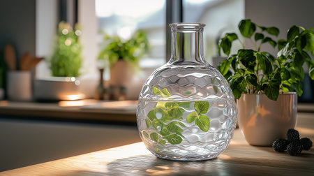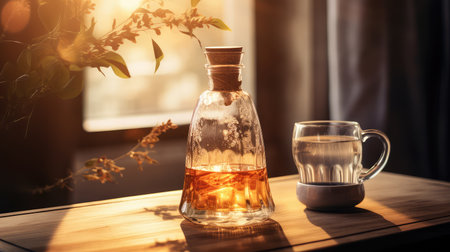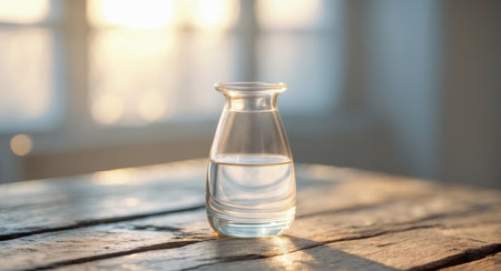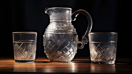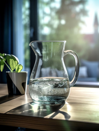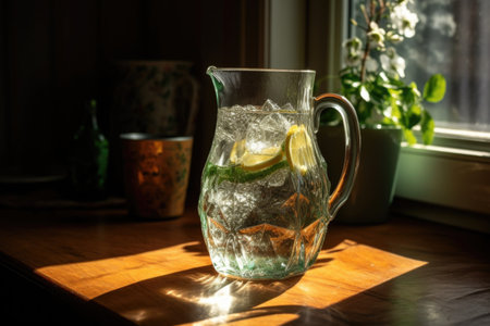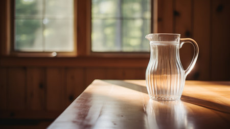 a pitcher sits on a table, bathed in sunlight streaming through a window. captured with the zeiss batis 18mm f2.8 lens, this photo showcases the transparent-translucent medium of the pitcher. set in rural america, the image features smooth lines and was created using focus stacking techniques. with its 8k resolution, this photo exudes a cabincore aesthetic. ai generated