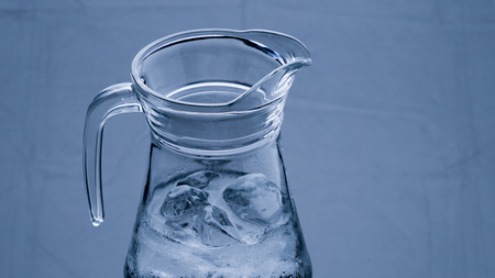 Fresh water pouring from the jug into a glass on the blue background with copy space. Drink water is important for optimal health